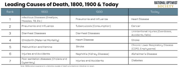 You get the picture. Over the last couple of centuries resourceful individuals, armed with new tools and growing scientific understanding, set their teeth to solving the then prevailing causes of mass death.