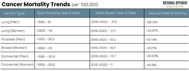 But the fight against the mass killers never rests, and so the world’s intellectual firepower has shifted its targets accordingly. Which is why, as you can see here, cancer deaths are down across the board in recent decades.