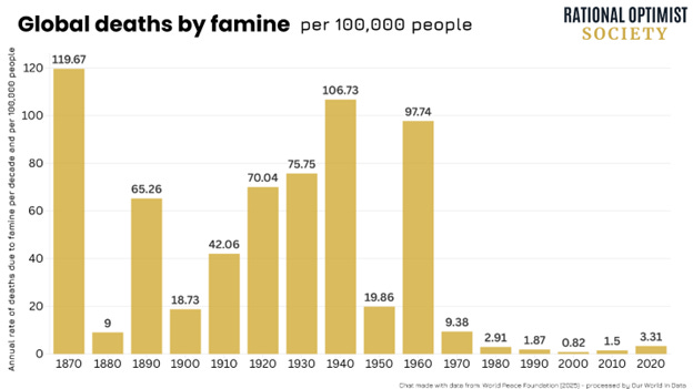 New fertilizers and the development of disease-resistant grains, as well as better refrigeration and an increase in global trade. When I was a child in the 1960s, we were regularly told to clean our plates “because there were people starving in China”. Over recent decades, famines have effectively been eradicated.