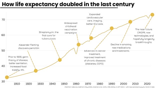 When thinking about extending lifespan, it’s useful to understand why the average lifespan doubled over the last century.