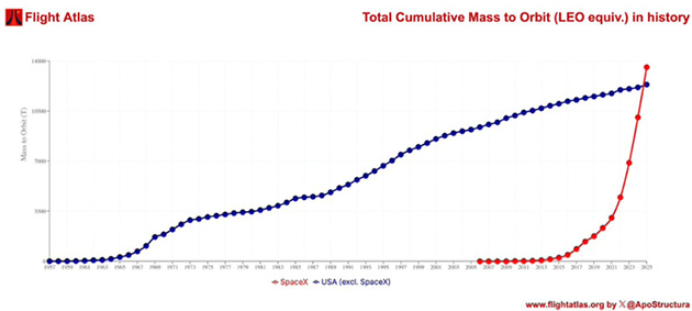 Elon’s SpaceX is the cleanest hockey stick chart in the world. It’s now launched more mass into orbit since its first flight in 2006 than every other US aerospace firm combined!
