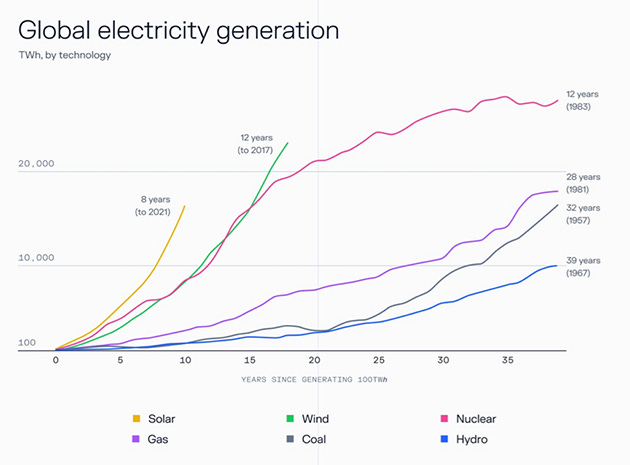 Second place goes to solar power. It’s now the fastest-growing energy technology in history: