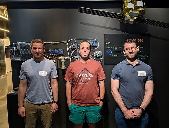 Here are Stephen, Gialich and I under a half-scale replica of AstroForge’s first exploratory space vehicle: