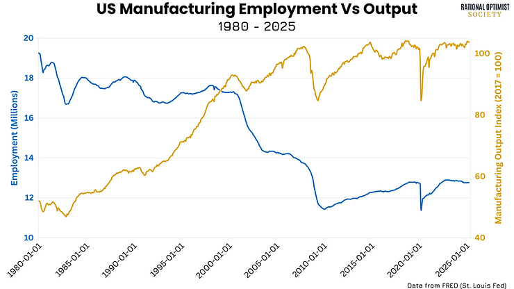 During the same period, US manufacturing output has more than doubled.