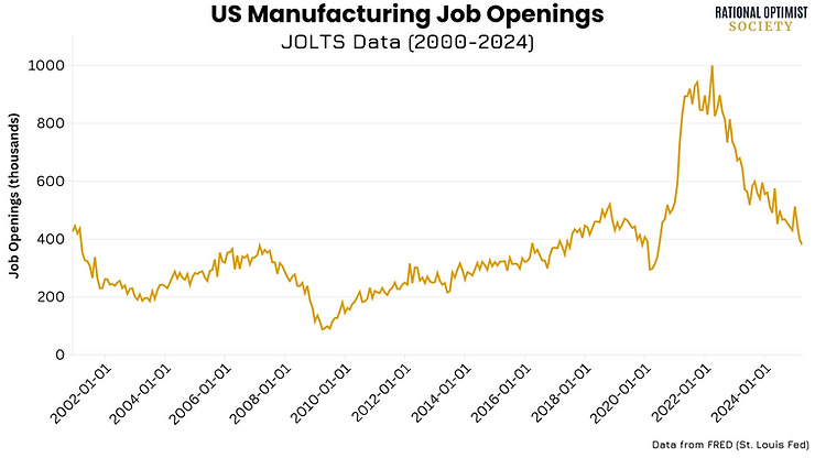 Even with offshoring shifting an unknowable number of manufacturing jobs to lower cost countries, hundreds of thousands of US manufacturing jobs have been left unfilled since the Bureau of Labor Statistics began tracking the data in 2000.