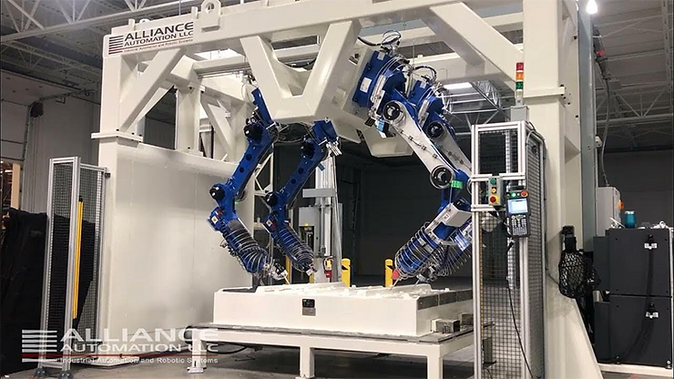 Pictured on the top is a multi-arm robotic MOTOMAN Waterjet cutting system. On the bottom is a far simpler one-arm MOTOMAN model designed for a small manufacturing company.
