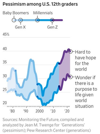 More 12th graders now say they find it hard to have hope for the world than at any time since at least 1976, according to a University of Michigan survey: